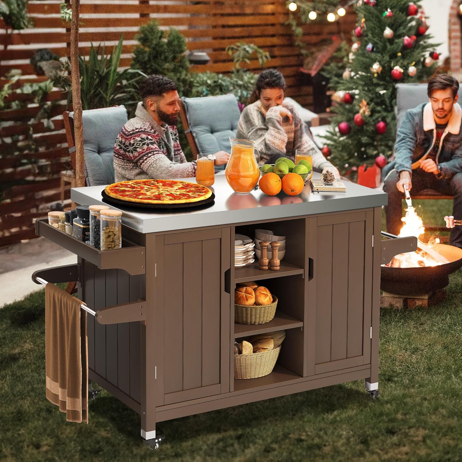 "XL Solid Wood Grill Cart Outdoor Storage Cabinet, Stainless Steel Top, Spice Rack, Side Handle, Brown"