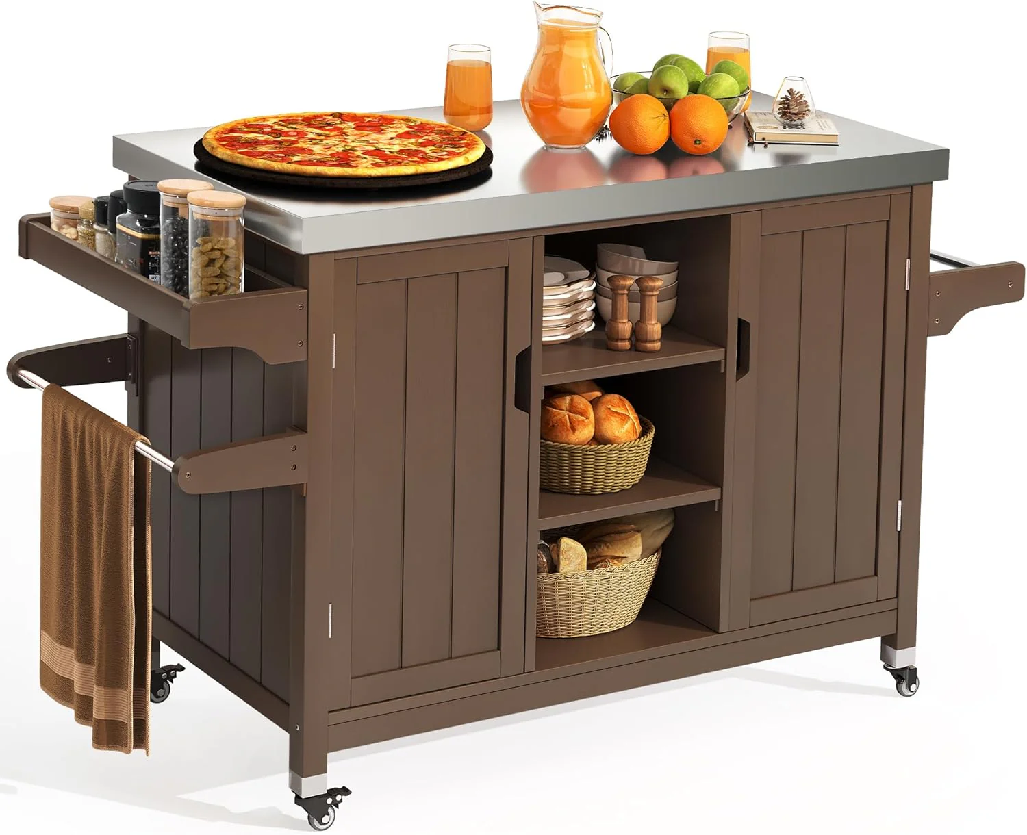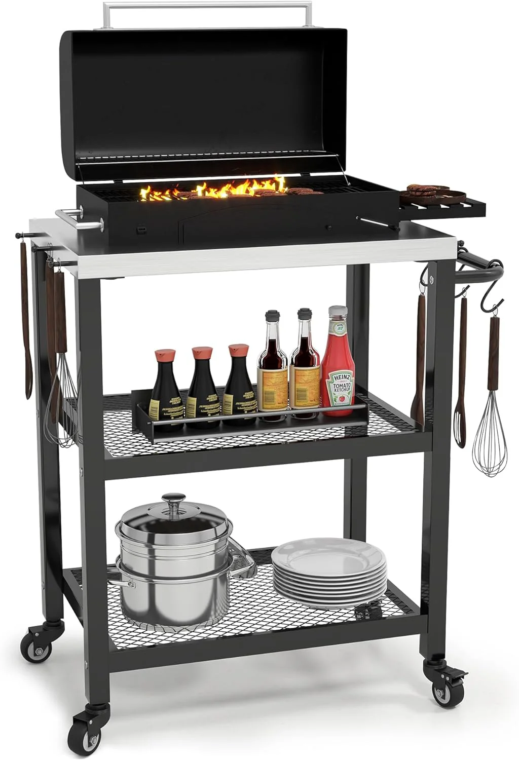 "Grill Table, Outdoor Kitchen Island on Wheels, Food Prep Table, Adjustable Shelf, Stainless Steel Top, Spice Rack, Hanging Hooks"
